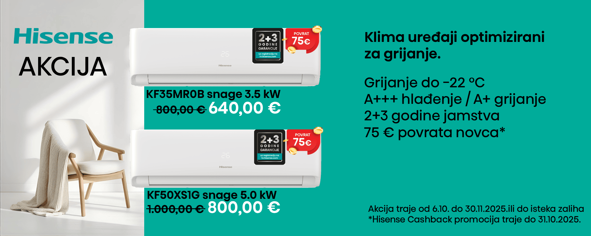 1. U razdoblju od do 31.10.2025. kod nas kupite odabrani set unutarnje i vanjske jedinice Hisense klima uređaja na koje se promocija odnosi.
