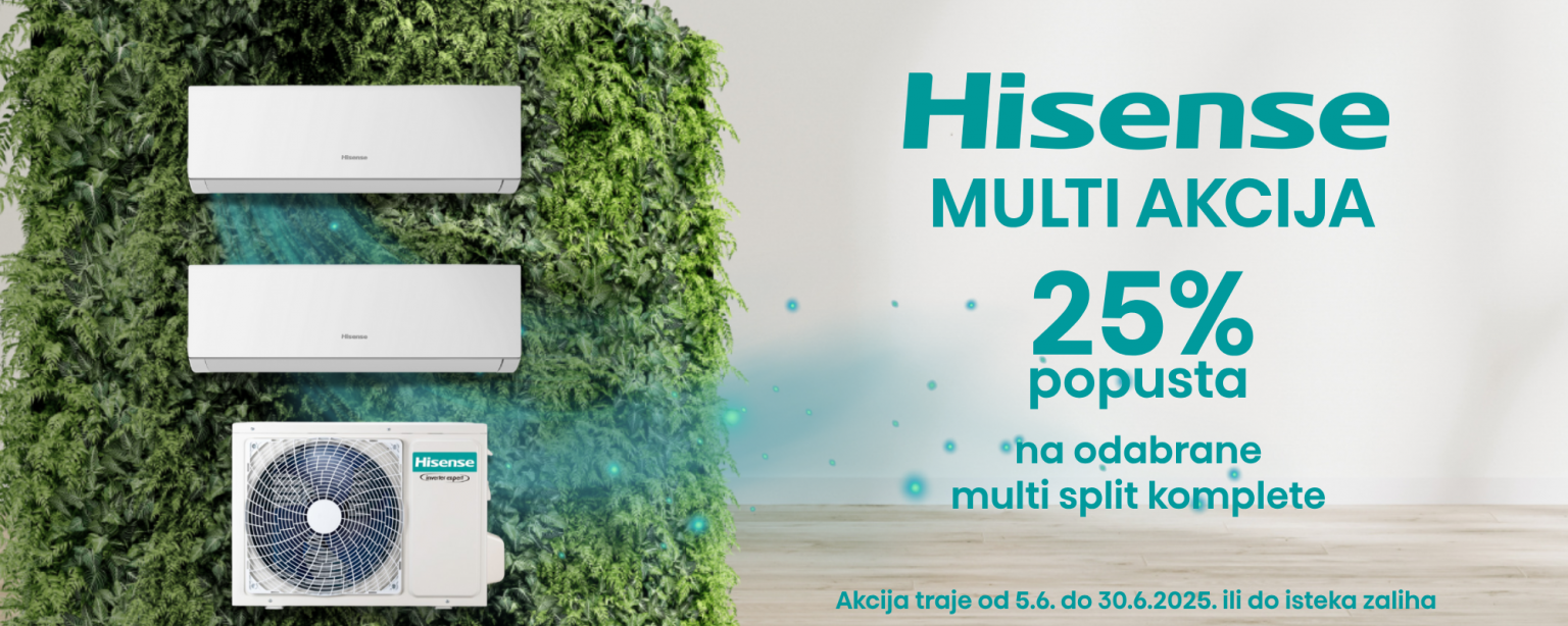 Kad vani zahladi, pravi komfor počinje u vaša četiri zida. Hisense multi sustavi klima uređaja donose vam savršenu kombinaciju učinkovitosti, tišine i uštede energije – i to sada uz 25% popusta na sve komplete!
